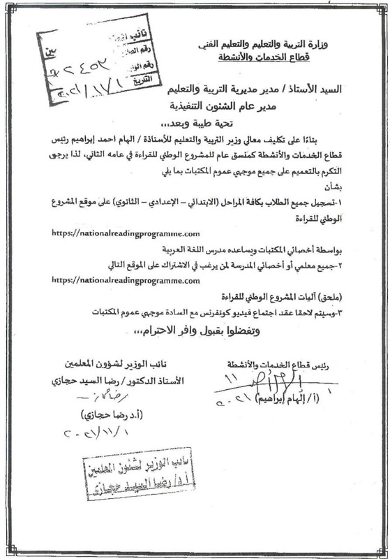 وجه قطاع الخدمات والأنشطة، بوزارة التربية والتعليم والتعليم الفني، خطاباً، لمديرى مديريات التربية والتعليم، بشأن تسجيل جميع الطلاب على موقع المشروع الوطني للقراءه.