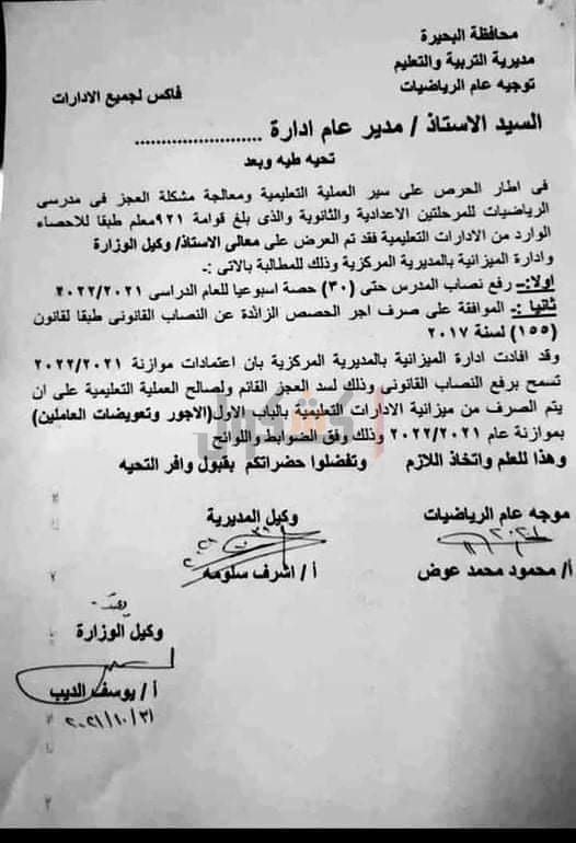 وجه توجيه عام الرياضيات بمديرية التربية والتعليم بمحافظة البحيرة فاكس لجميع الادارات، بشأن أنصبة المعلمين بالعام الدراسي 2021_ 2022.