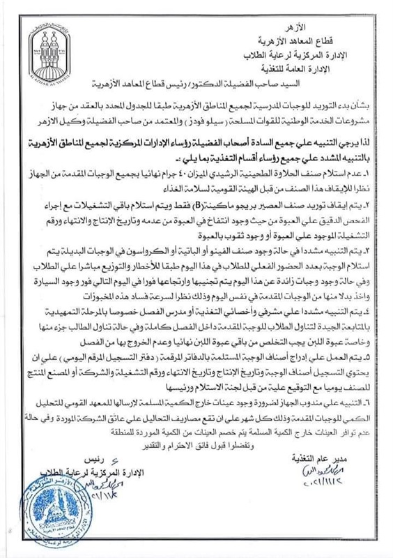ونبه قطاع المعاهد الأزهرية، على أنه حال وجود الفينو أو الباتيه أو الكرواسون في الوجبات البديلة، يتم استلام الوجبة بعدد الحضور الفعلي للطلاب في هذا اليوم طبقا للإخطار والتوزيع عليهم مباشرة، وحالة وجود وجبات زائدة يتم تجنيبها وإرجاعها في اليوم التالي، فور وجود السيارة، وأخذ بدلا منها من الوجبات المقدمة في نفس اليوم، لسرعة فساد هذا النوع من المخبوزات.