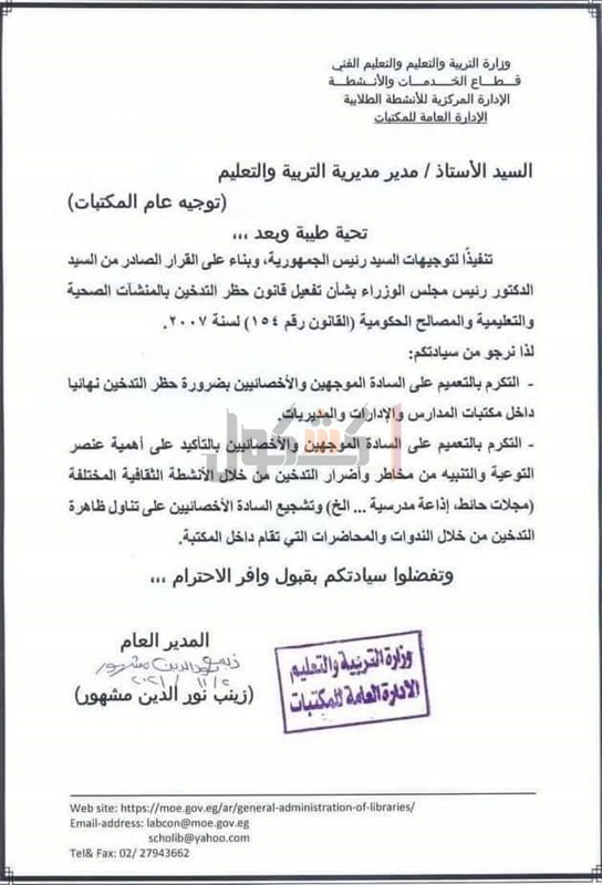 _ التعميم على الموجهين والأخصائيين بضرورة حظر التدخين نهائيا داخل مكتبات المدارس والإدارات والمديريات