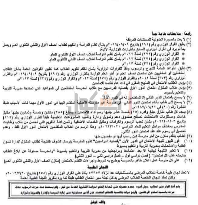 ٢- الطالب الراسب عاميين متتاليين في الصف الأول الثانوي يؤدى الامتحان على نظام المنازل ويحق له اعادة القيد كطالب منتظم في العام التالي لنجاحه
