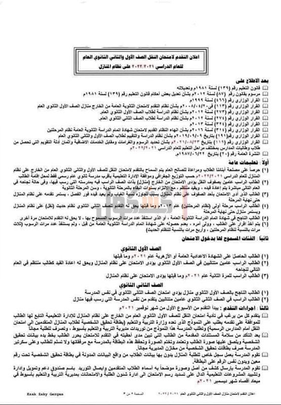 أصدرت وزارة التربية والتعليم والتعليم الفني، خطاب بالتعليمات التقدم لامتحانات النقل للصفين الاول والثاني الثانوي بالعام الدراسي الحالي ٢٠٢١/٢٠٢٢.