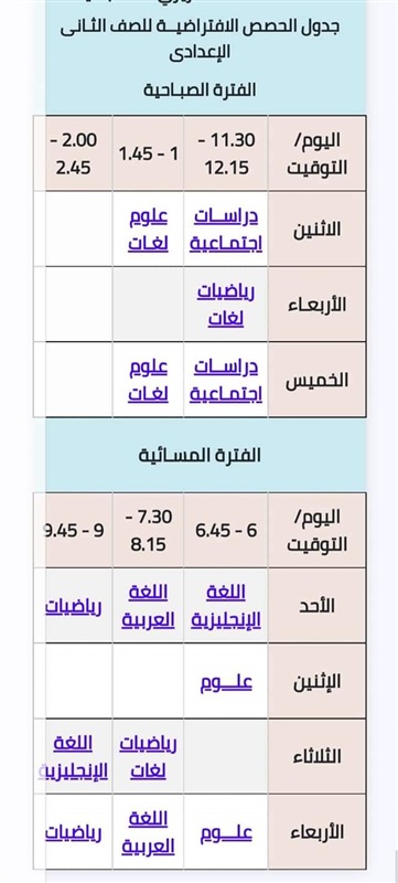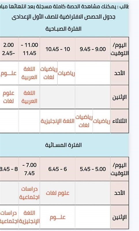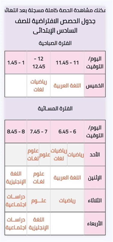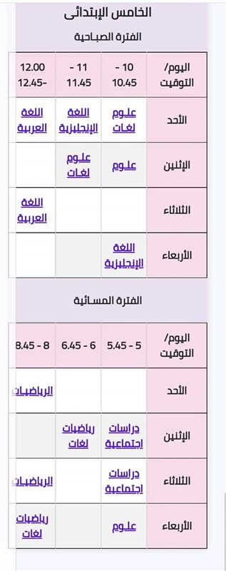 أعلنت إدارة التعليم الإلكتروني بوزارة التربية والتعليم، جداول حصص البث المباشر التي يتم اذاعتها على منصة البث المباشر.