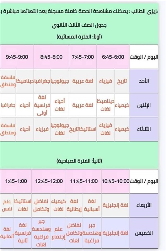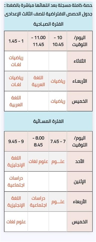لطلاب الإعدادي والثانوي.. جداول حصص البث المباشر