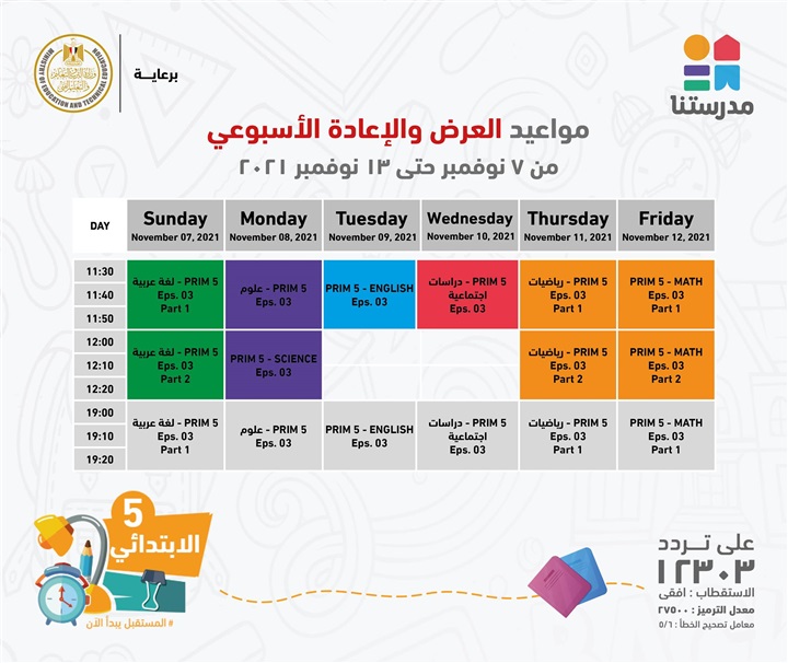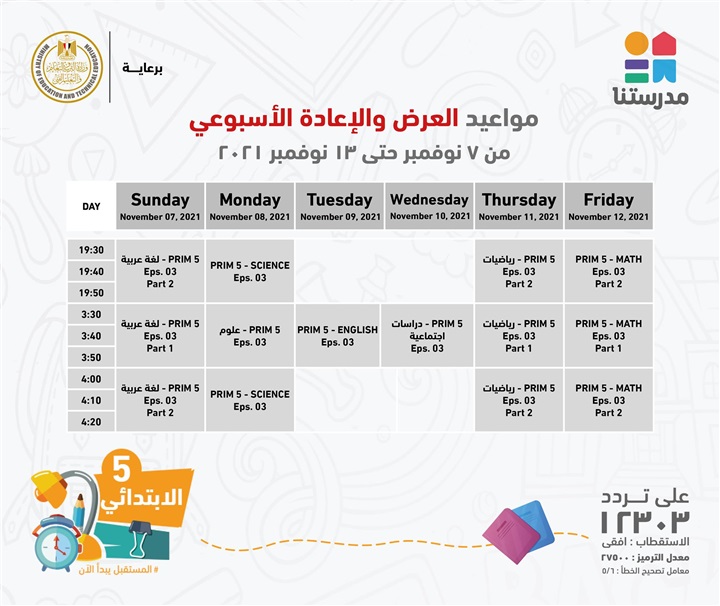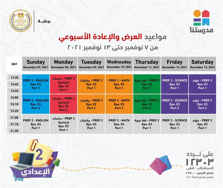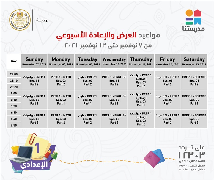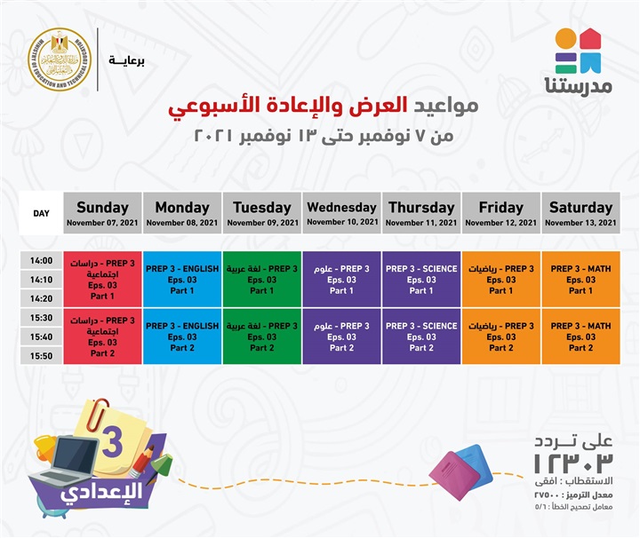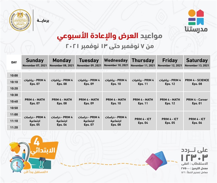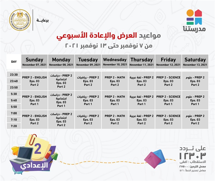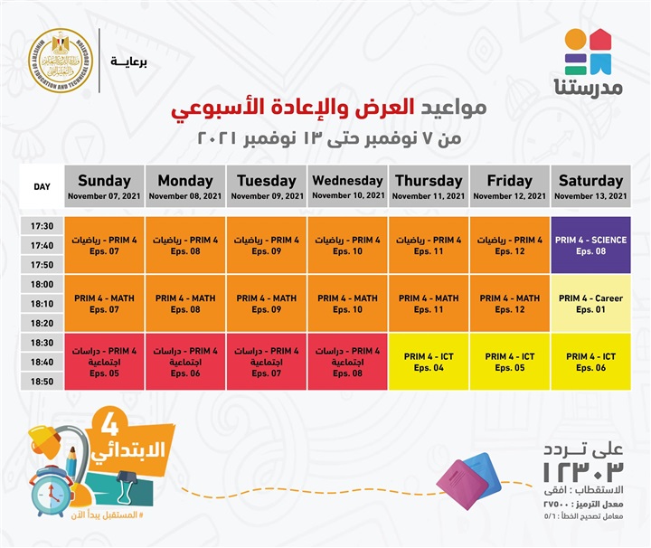 المقرر إذاعتها على قناة مدرستنا من اليوم الأحد من ٧ نوفمبر حتى ١٣ نوفمبر 2021، بالإضافة