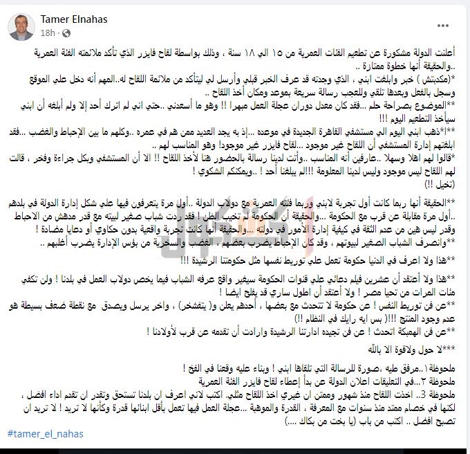 ولفت في منشور له عبر فيسبوك، أن نجله قام بتسجيل نفسه على اللينك الذي حددته وزارة الصحة للحصول على اللقاح، ثم توجه إلى مستشفى القاهرة الجديدة بناء على رسالة وصلته، إلا أنه فوجئ عند ذهابه فى الموعد بوجود العشرات غيره ممن فى مثل عمره، ما أدى لإصابته بالإحباط بعدما بلغتهم إدارة المستشفى بعدم توافر اللقاح، لافتة إلى أنه يمكن للمتضررين التقدم بشكوى.