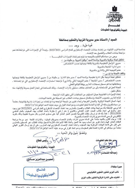 قطاع الجودة وتكنولوجيا المعلومات بوزارة التربية والتعليم والتعليم الفني، خطاباَ