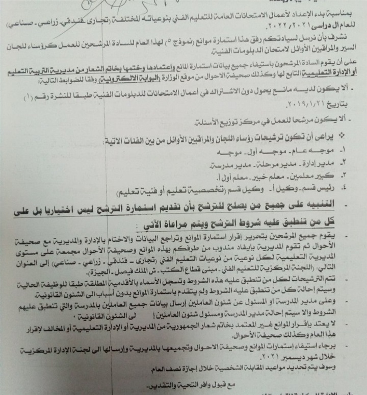 الترشح للراغبين بالعمل كرؤساء ومراقبين أوائل لجان امتحانات للدبلومات الفنية