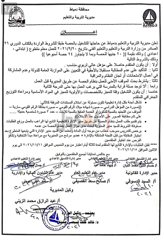 أعلنت مديرية التربية والتعليم في محافظة دمياط، برئاسة الدكتور خالد القبيصي اليوم، عن فتح باب التطوع لراغبين في العمل كمعلمين، في إطار جهود المديرية لسد العجز بالمعلمين في مختلف التخصصات، وفقا خطط وزارة التربية والتعليم، وذلك بالمدارس الابتدائية والإعدادية بقيمة 20 جنيها للحصة، وعلى ألا يتجاوز معدل الحصص للمقبولين 24 حصة بالأسبوع.
