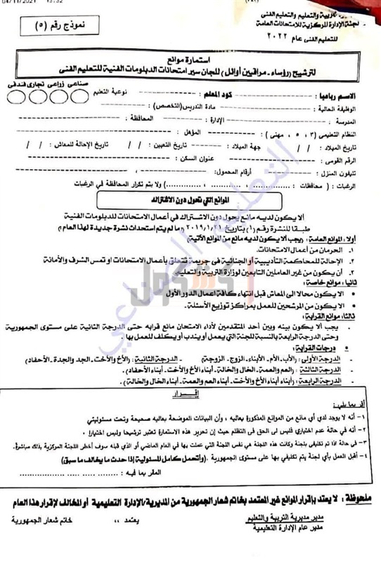 اتاحت وزارة التربية والتعليم والتعليم الفني، إستمارة موانع المشاركة في أعمال امتحانات الدبلومات الفنية، بالعام الدراسى الحالي ٢٠٢١/ ٢٠٢٢م، لترشيح رؤساء لجان ومراقين أوائل بمختلف نوعيات التعليم الفني( الصناعي، التجاري، الزراعي والفندقي)، وجاءت كالتالى: