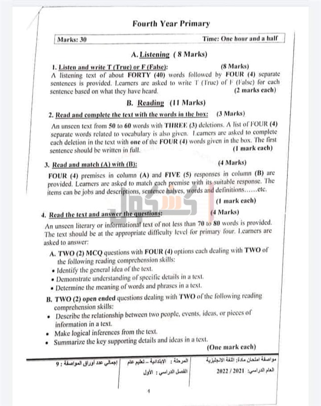 ننشر مواصفات الورقة الامتحانية لمادة اللغة الإنجليزية الصف الرابع الابتدائي 2022