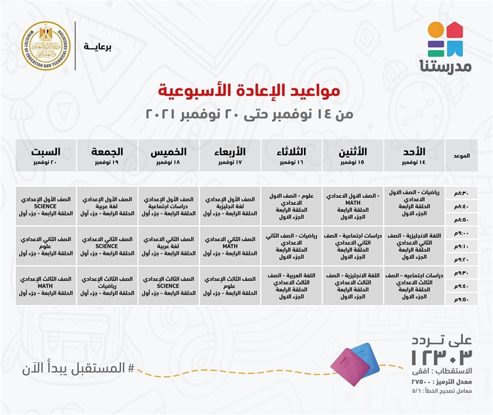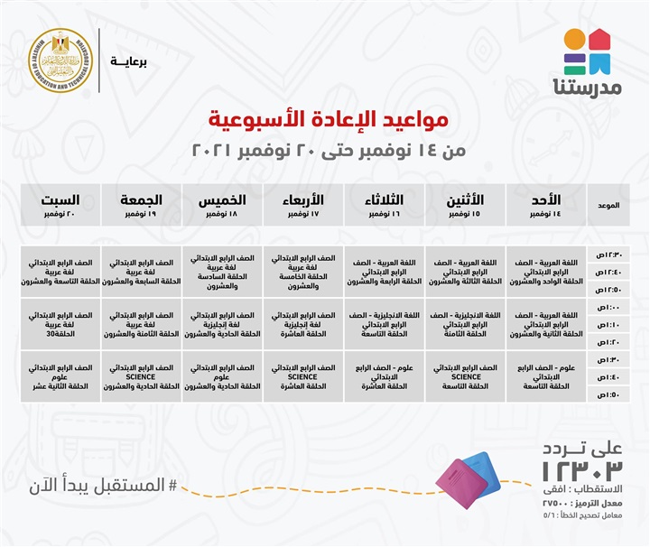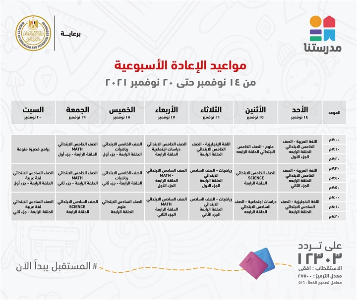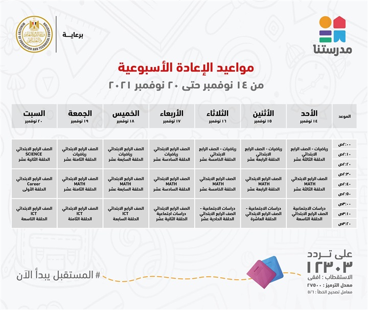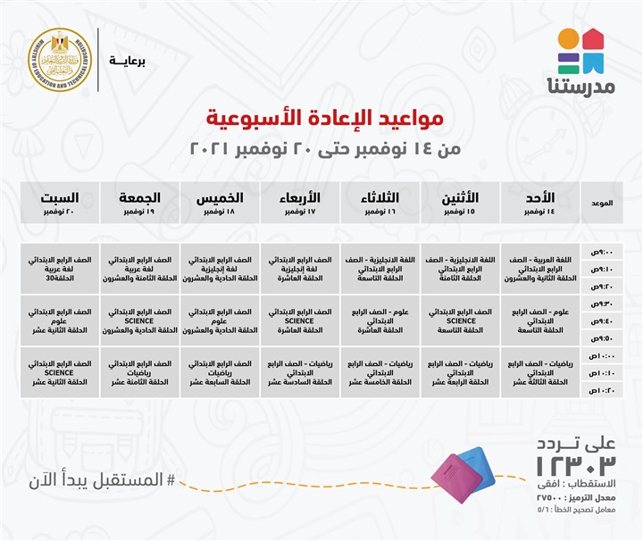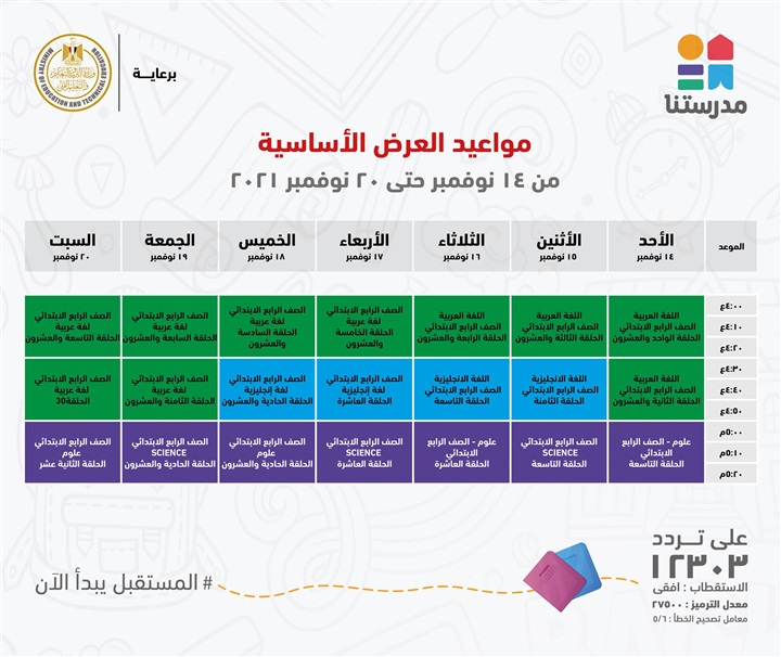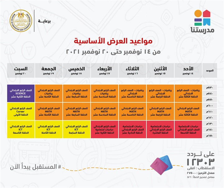 أعلننت وزارة التربية والتعليم والتعليم الفني، المواعيد الخاصه بعرض البرامج التعليمية الجديدة على قناة"مدرستنا" بالأسبوع الحالي بشهر نوفمبر 2021.