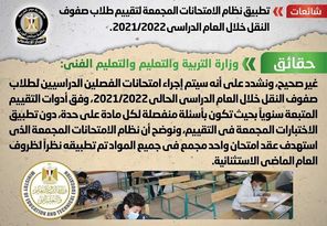 وأكد المركز الاعلامى أنه لا صحة لتطبيق نظام الامتحانات المجمعة لتقييم طلاب صفوف النقل خلال العام الدراسي 2021/2022، مُشددةً على أنه سيتم إجراء امتحانات الفصليين الدراسيين لطلاب صفوف النقل خلال العام الدراسي الحالي 2021/2022، وفق أدوات التقييم المتبعة سنوياً بحيث تكون بأسئلة منفصلة لكل مادة على حدة، دون تطبيق الاختبارات المجمعة في التقييم، مُوضحةً أن نظام الامتحانات المجمعة الذي استهدف عقد امتحان واحد مجمع في جميع المواد تم تطبيقه نظراً لظروف العام الماضي الاستثنائية.