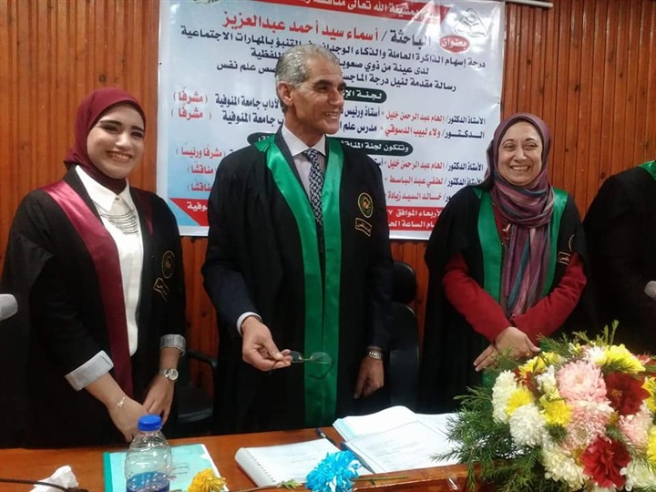 حصلت الباحثة أسماء سيد أحمد عبد العزيز علي درجة الماجستير بقسم علم النفس كلية الآداب جامعة المنوفية، عن رسالتها بعنوان "درجة اسهام الذاكرة العاملة والذكاء الوجداني في التنبؤ بالمهارات الاجتماعية لدي عينة من ذوي صعوبات التعلم غير اللفظية".