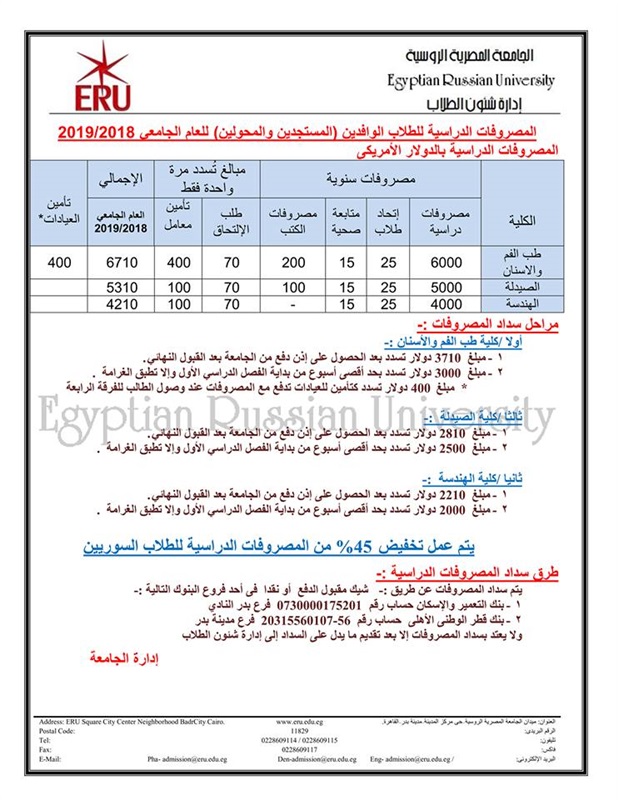 أعلنت الجامعة المصرية الروسية، عن المصروفات الدراسية للطلاب المصريين والوافدين"المستجدين والمحولين"، وذلك للعام الجامعى 2018/2019، حيث أن المصروفات الدراسية للطلاب الوافدين بالدولار الأمريكي.