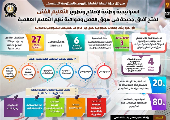 مختلفة، بينما مستهدف افتتاح 27 جامعة تكنولوجية بحلول عام ٢٠٣٠ لتخريج 30 ألف طالب