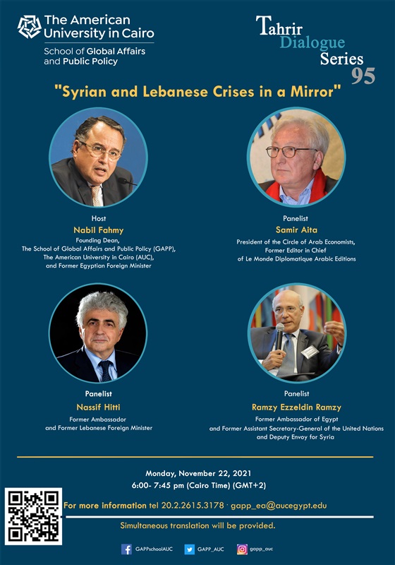 تعقد كلية الشئون الدولية والسياسة العامة بالجامعة الأمريكية بالقاهرة محاضرة عبر الانترنت بعنوان "الأزمات السورية واللبنانية في المرآة" كجزء من سلسلة محاضرات حوار التحرير عبر الإنترنت.