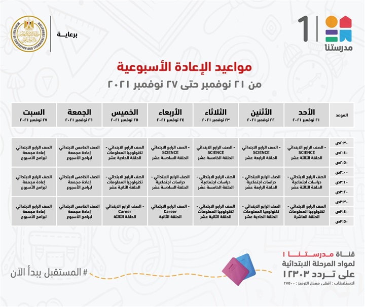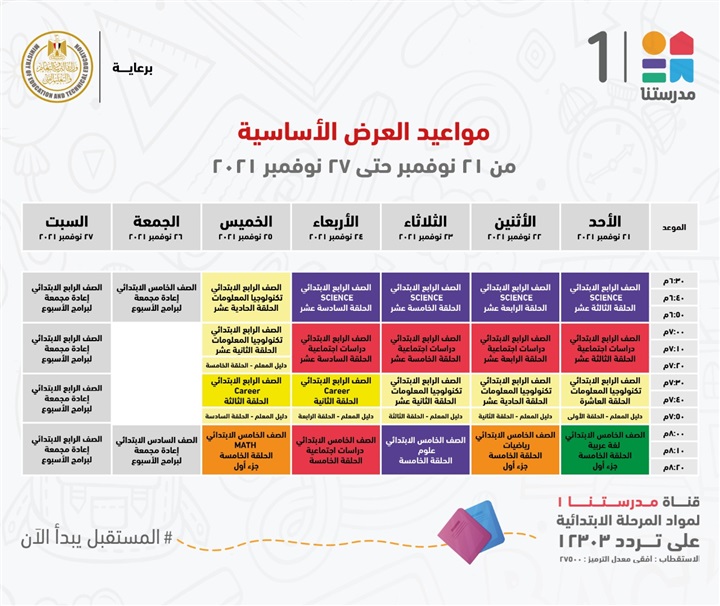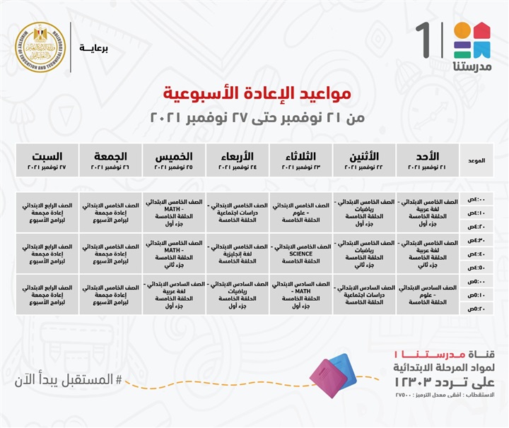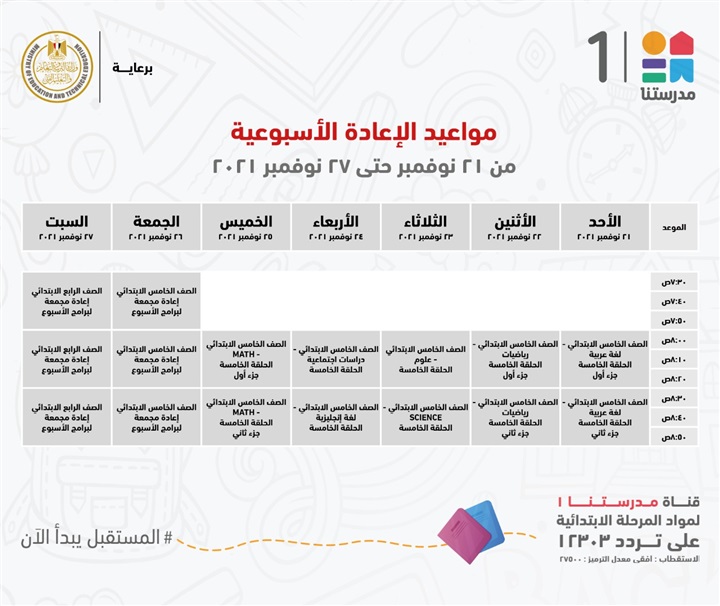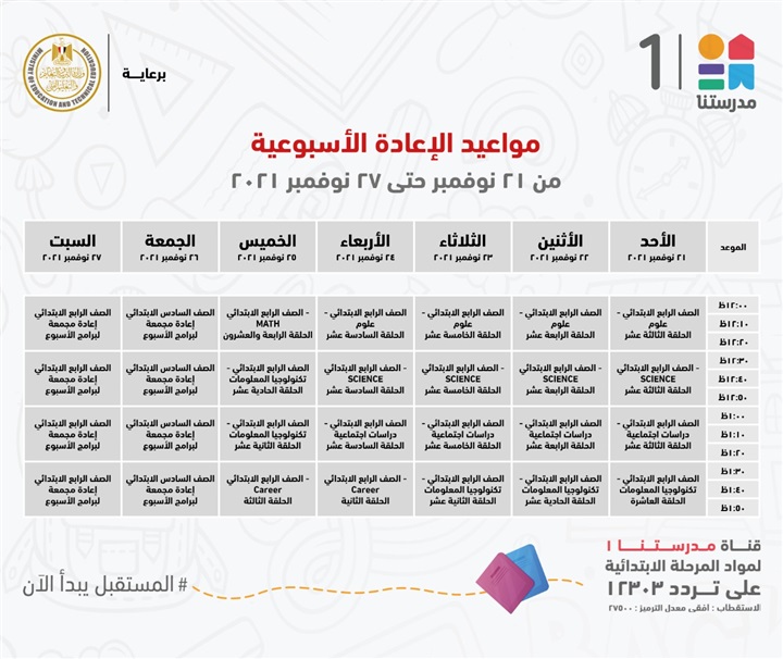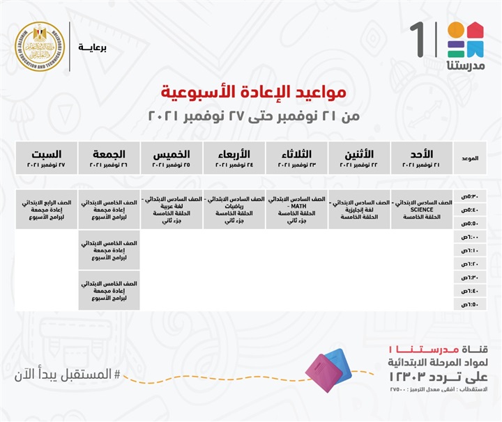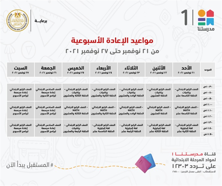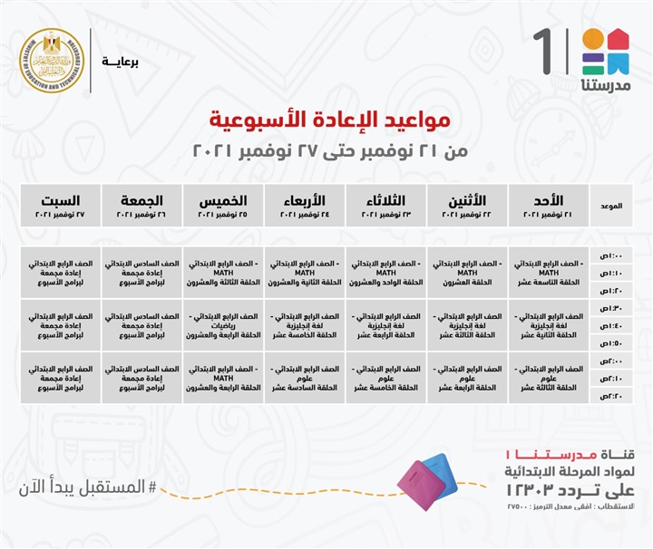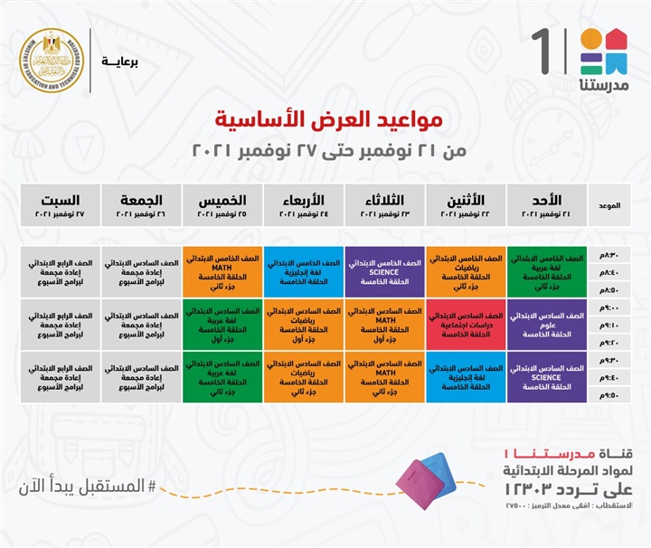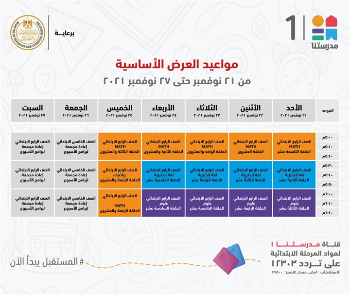 أعلنت وزارة التربية والتعليم والتعليم الفني مواعيد بث البرامج التعليمية لطلاب المرحلة الابتدائية، عبر قناة" مدرستنا1" في الفترة من 21 نوفمبر حتى 27 نوفمبر باللغة العربية مع الإعادة.