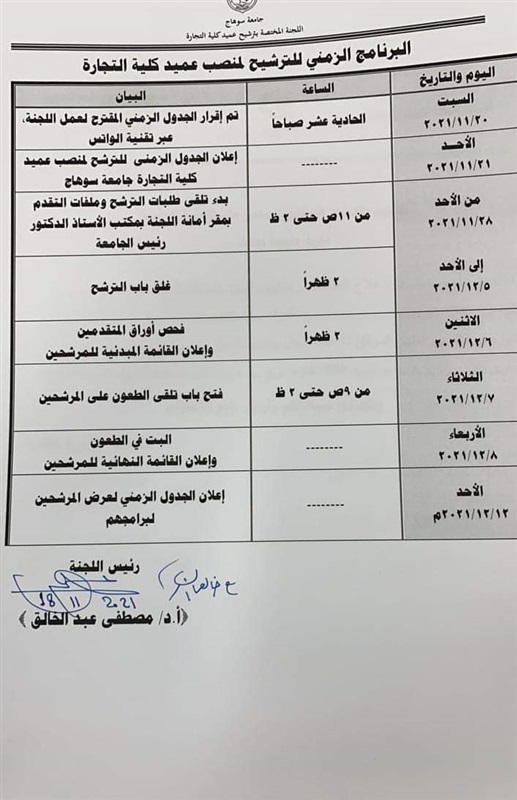 أعلن الدكتور مصطفى عبدالخالق رئيس جامعة سوهاج، الجدول الزمني للترشح لمنصب عميد كلية التجارة، والذى يستمر فى الفترة من 21 نوفمبر الجاري حتى 12 من ديسمبر المقبل، موضحاً أن برنامج الجدول الزمني تم إقراره عبر تقنية الواتس، ثم تم إعلانه اليوم الأحد، مشيراً إلى أن يوم الأحد القادم الموافق 28 نوفمبر، سيتم تلقي طلبات الترشح وملفات التقديم بمقر أمانة اللجنة بمكتب رئيس الجامعة، على أن يتم غلق باب الترشيح الأحد 5 ديسمبر.