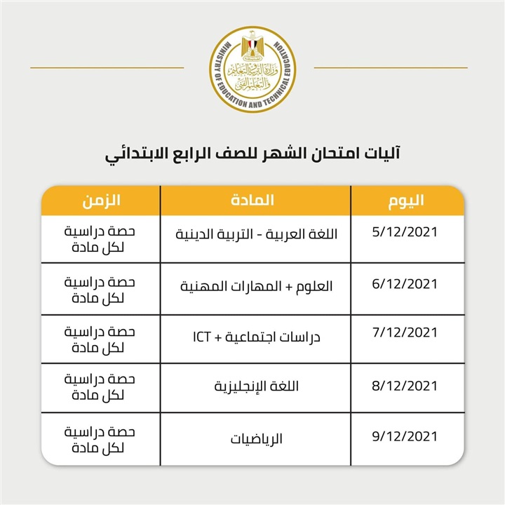 وكانت قد أكدت وزارة التربية والتعليم، لجميع الطلاب أنه يتم امتحان شهري أكتوبر ونوفمبر لطلاب الصف الرابع الابتدائي، وفقًا للجدول المرفق بدءا من يوم ٥ ديسمبر القادم مع ملاحظة الآتي: