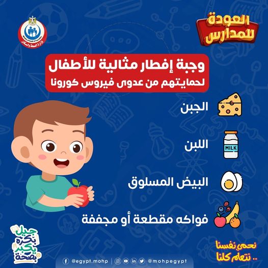 أشارت وزارة الصحة والسكان، إلى أهمية وجبة الإفطار لتقوية مناعة الأطفال ضد الفيروسات والأمراض وخاصة فيروس كورونا"كوفيد-19".