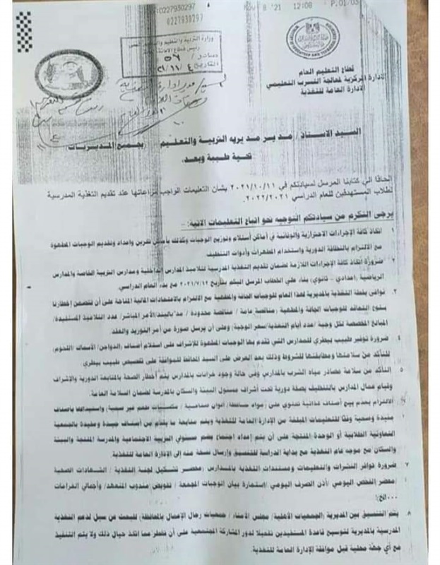 ٢.ضرورة اتخاذ كافة الاجراءات اللازمة لضمان تقديم التغذية المدرسية لتلاميذ المدارس الداخلية ومدارس التربية الخاصة والمدارس الرياضية (اعدادي - ثانوي).