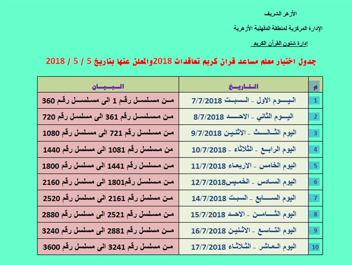 حصل "كشكول" على جدول اختبار معلم مساعد قرآن كريم تعاقدات 2018، الذي عنها الأزهر الشريف في 5 مايو الماضي.