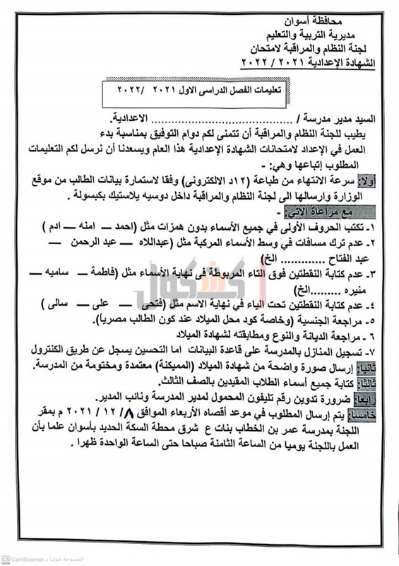 كشف خطاب حصل عليه موقع «كشكول» تعليمات وزارة التربية والتعليم والتعليم الفني، لتحرير استمارة امتحانات الشهادة الإعدادية بالفصل الدراسي الأول للعام 2021 _ 2022.