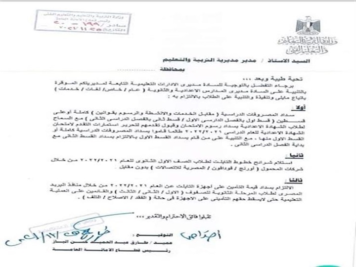وجهت وزارة التربية والتعليم والتعليم الفني، تعليمات مهمة للمديريات التعليمية، بشأت سداد المصروفات المدرسية .