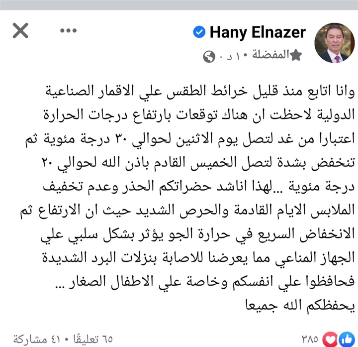 وقال الدكتور هاني الناظر، منشور عبر حسابه الرسمي على موقع التواصل الاجتماعي" فيس بوك" :" اتابع منذ قليل خرائط الطقس علي الأقمار الصناعية الدولية لاحظت أن هناك توقعات بارتفاع درجات الحرارة اعتبارا من غد لتصل يوم الاثنين لحوالي ٣٠ درجة مئوية ثم تنخفض بشدة لتصل الخميس القادم لحوالي ٢٠ درجة مئوية".