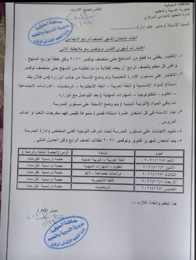وجهت مديرية التربيه والتعليم والتعليم الفني بمحافظة المنوفية، خطابا لجميع الادارات التعليمية، بشأن أليات امتحان الشهر للصف الرابع الابتدائي.