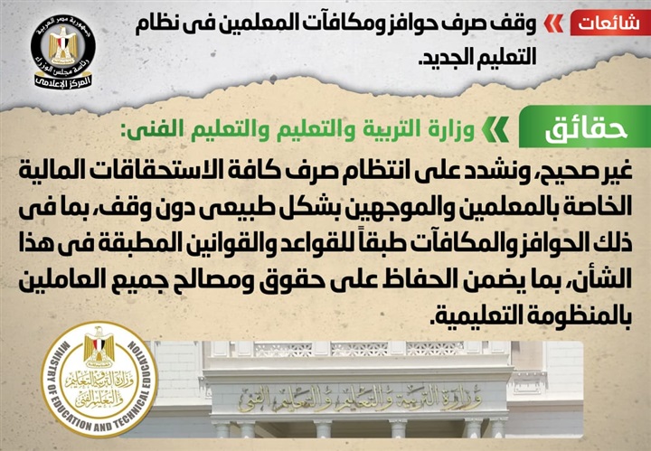 وأكدت أنه لا صحة لوقف صرف حوافز ومكافآت المعلمين في نظام التعليم الجديد، مُشددةً على انتظام صرف كافة الاستحقاقات المالية الخاصة بالمعلمين والموجهين بشكل طبيعي دون وقف، بما في ذلك الحوافز والمكافآت طبقاً للقواعد والقوانين المطبقة في هذا الشأن، بما يضمن الحفاظ على حقوق ومصالح جميع العاملين بالمنظومة التعليمية.