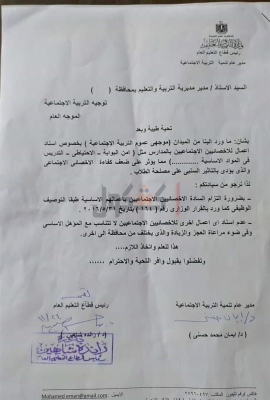 وقالت الوزارة في خطابها: بشأن ما ورد تلينا من الميدان موجهي عموم التربية الاجتماعية بخصوص إسناد أعمال للاخصائين الاجتماعيين بالمدارس مثل أمن البوابة والاحتياط والتدريس في المواد الأساسية مما يؤثر علي ضعف الكفاءة الخاصة بالاخصائي الاجتماعي والذي يؤثر بالسلب علي مصلحة الطلاب .