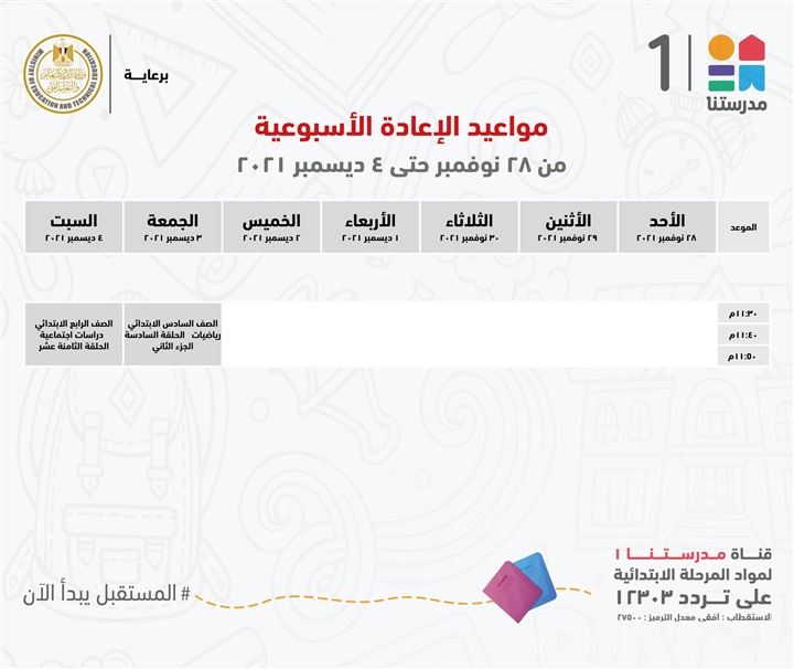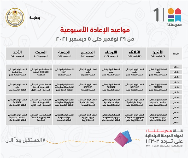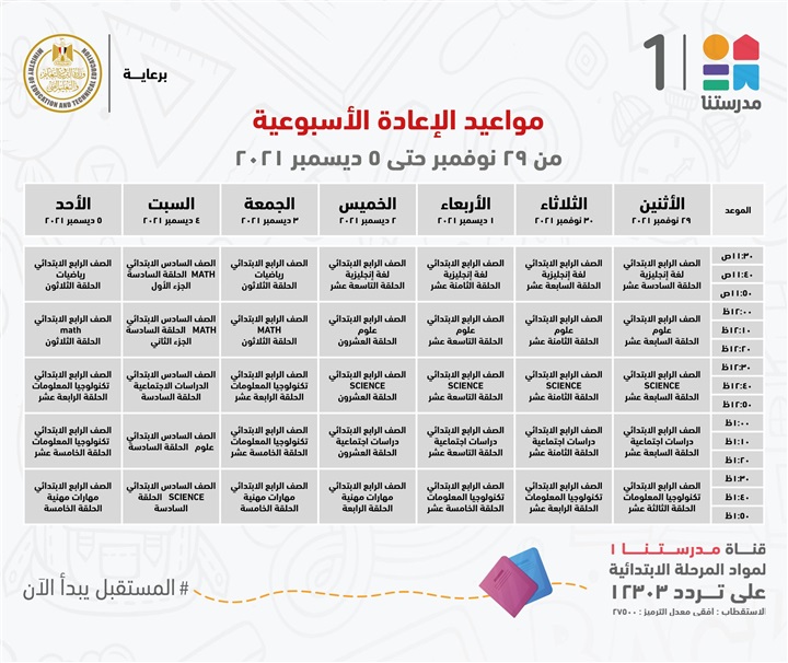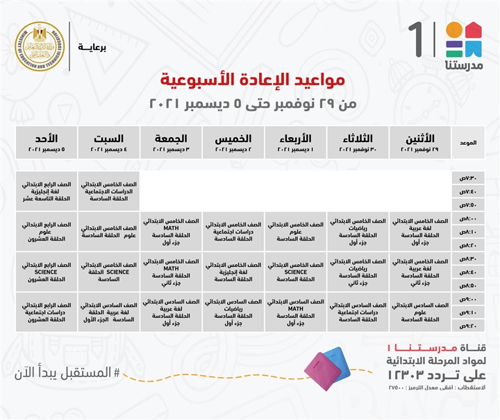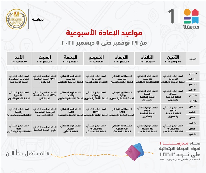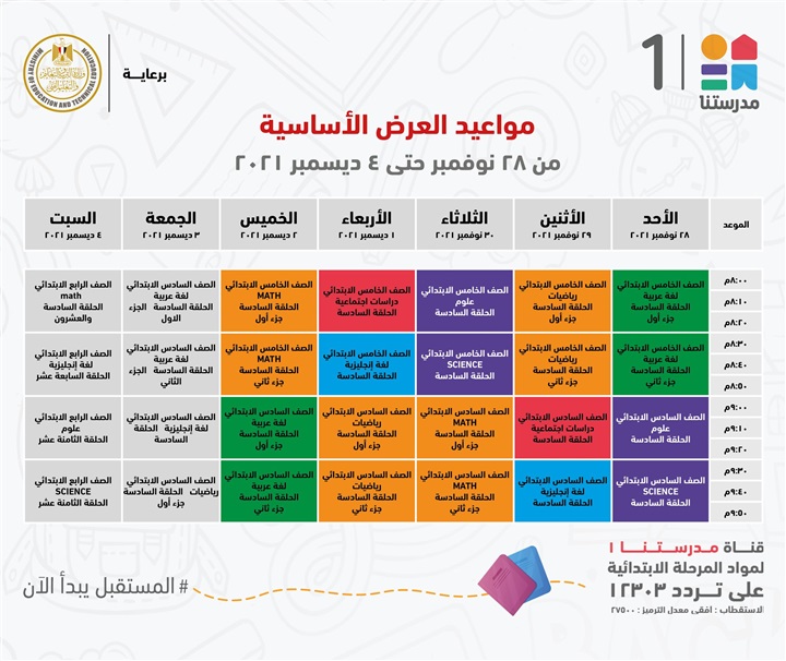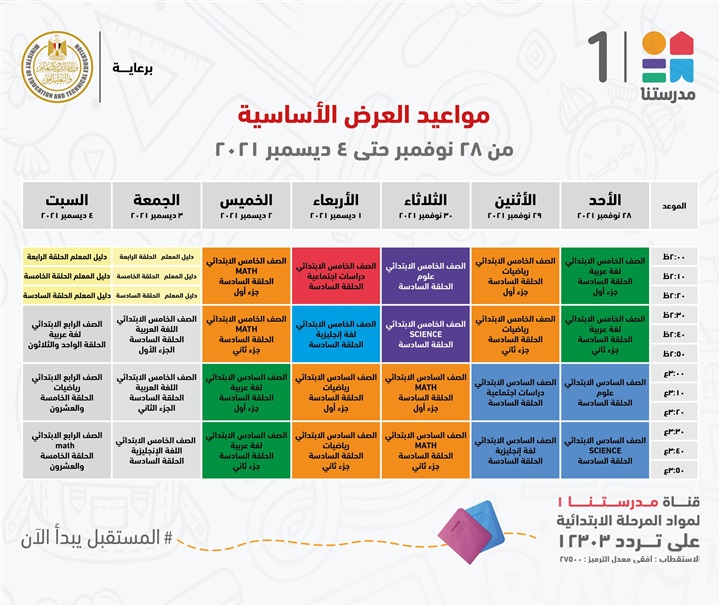 أعلنت وزارة التربية والتعليم والتعليم الفني مواعيد بث البرامج التعليمية لطلاب المرحلة الابتدائية عبر قناة" مدرستنا1" في الفترة من 28 نوفمبر حتي 4 ديسمبر باللغة العربية مع الإعادة.