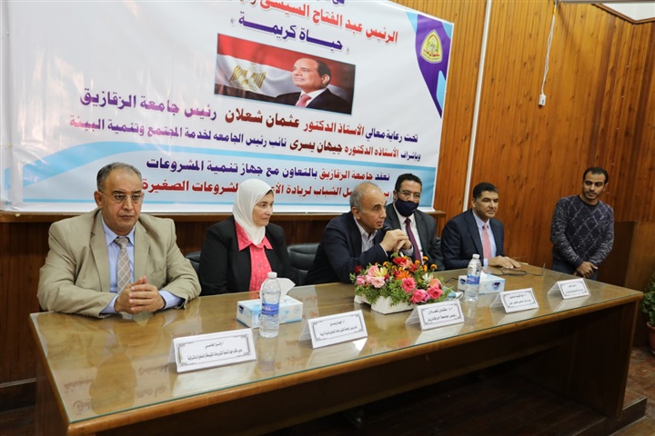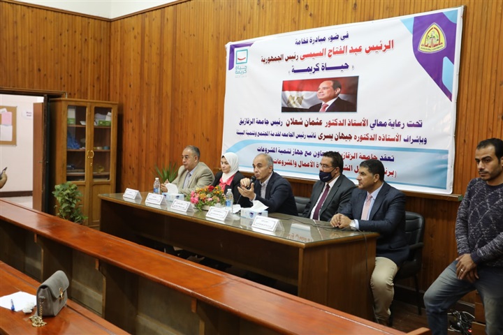 وذلك في إطار مبادرة الرئيس عبدالفتاح السيسي رئيس الجمهورية، "حياة كريمة"، وتحت رعاية الدكتور عثمان شعلان رئيس جامعة الزقازيق، وتحت إشراف الدكتورة جيهان يسري نائب رئيس الجامعة لشئون خدمة المجتمع وتنمية البيئة، وبالتعاون مع جهاز تنمية المشروعات المتوسطة والصغيرة والمتناهية الصغر بمجلس الوزراء، وبحضور الدكتور محمود زيم العابدين مدير إدارة ريادة الأعمال بجهاز تنمية المشروعات، ومحمد عباس مدير إدارة التدريب بجهاز تنمية المشروعات بالشرقية.