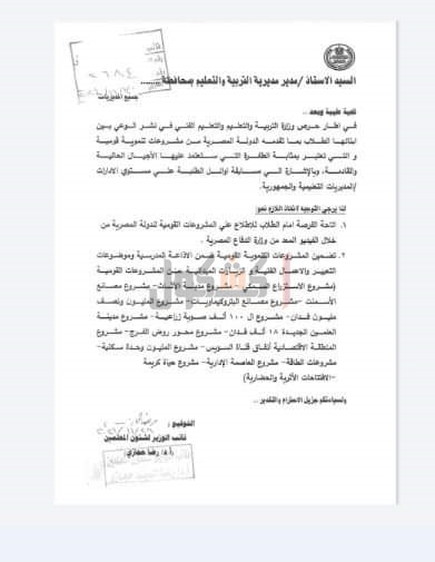 " إنه فى إطار حرص الوزارة على نشر الوعى بين أبنائها الطلاب بما تقدمه الدولة المصرية من مشروعات تنموية قومية والتى تعتبر بمثابة الطفرة التى ستعقد عليها الأجيال الحالية والقادمة، وبالإشارة إلى مسابقة أوائل الطلبة على مستوى الإدارات والمديريات.
