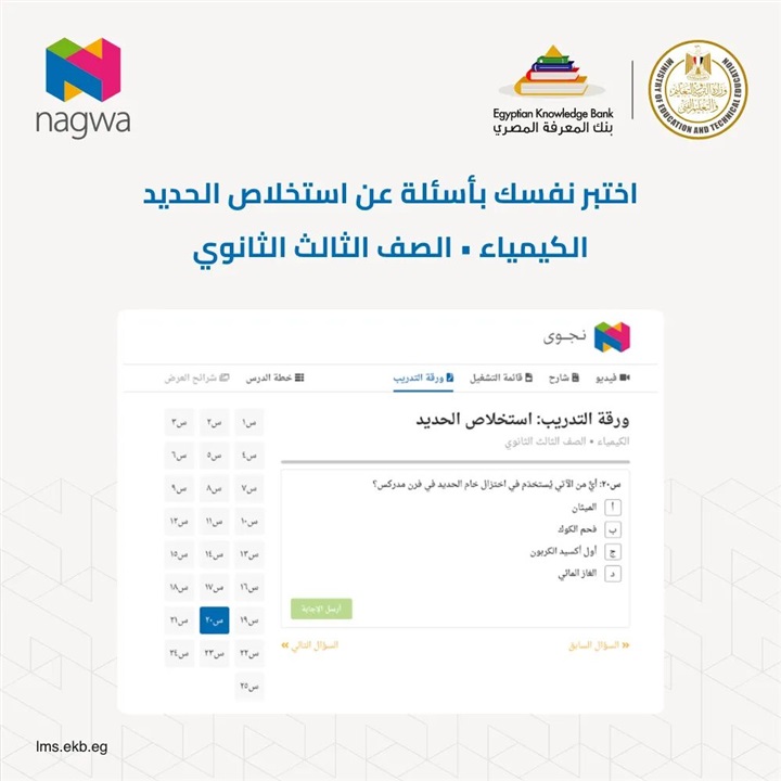 وأضاف الوزير:" وذلك من خلال استخدام مصادر نجوى ليمتد الموجودة على منصَّة إدارة التعلُّم LMS من خلال بنك المعرفة المصري: هنا.