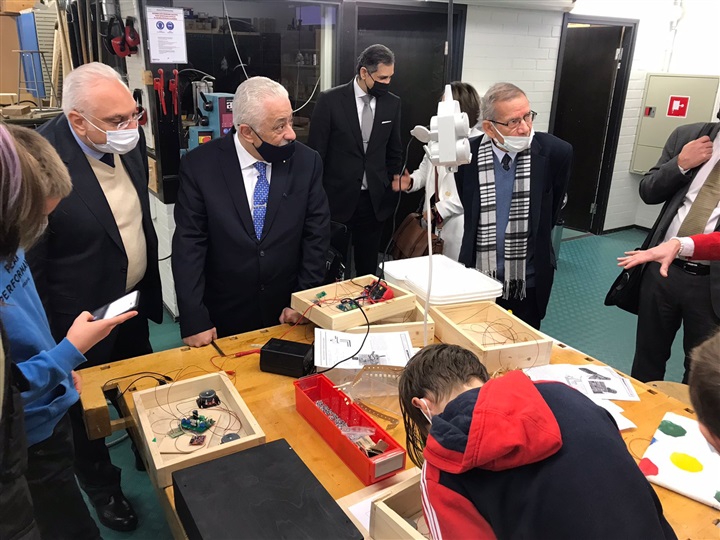 ورافق الوزير خلال الجولة السفير هيثم صلاح سفير مصر في هلسنكي، والسفير بيكا كوسون سفير فنلندا بالقاهرة، والدكتور محمد مجاهد نائب الوزير للتعليم الفني، والدكتور عمرو بصيلة رئيس الإدارة المركزية لتطوير التعليم الفني ومدير وحدة تشغيل وإدارة مدارس التكنولوجيا التطبيقية.
