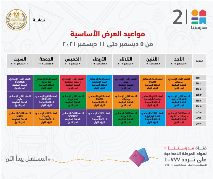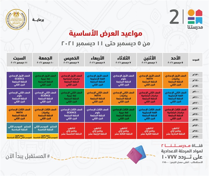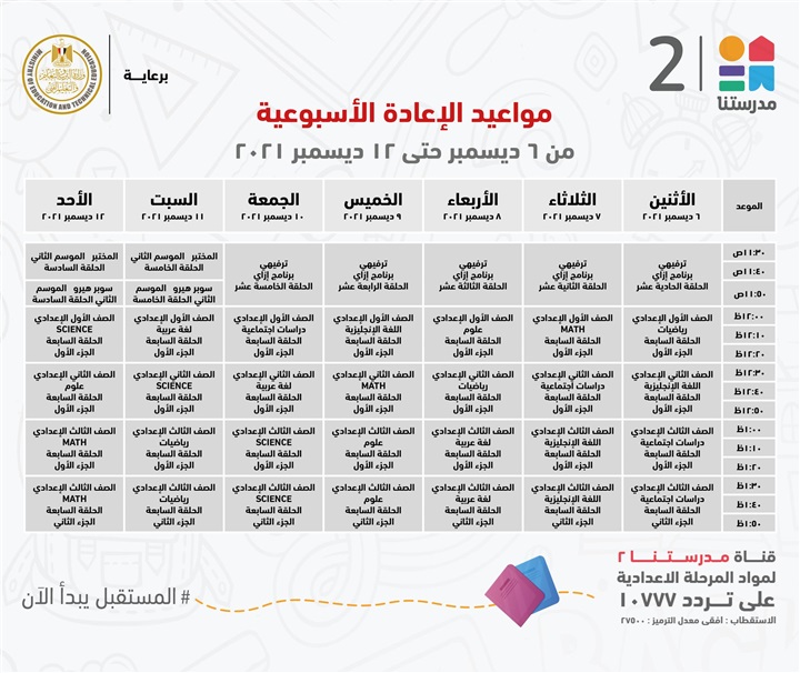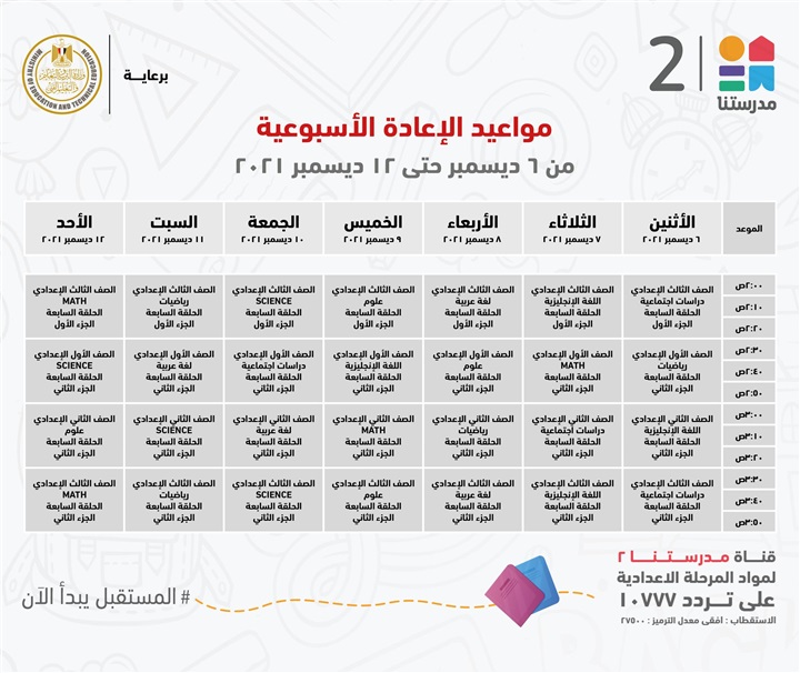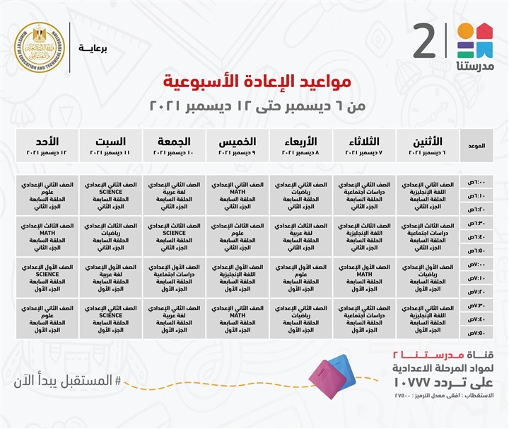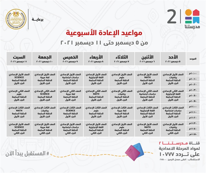 أعلنت وزارة التربية والتعليم والتعليم الفني مواعيد بث البرامج التعليمية لطلاب المرحلة الإعدادية عبر قناة" مدرستنا2"، في الفترة من 5 ديسمبر حتي 11 ديسمبر باللغة العربية مع الإعادة.