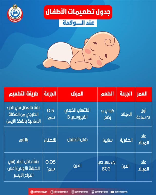 ننشر جدول تطعيمات الأطفال من عمر يوم وحتى 18 شهرا وذلك في إطار حمايتهم من الأمراض الوبائية التي لها تأثيرات مختلفة على الصحة العامة وتفشى الأوبئة.