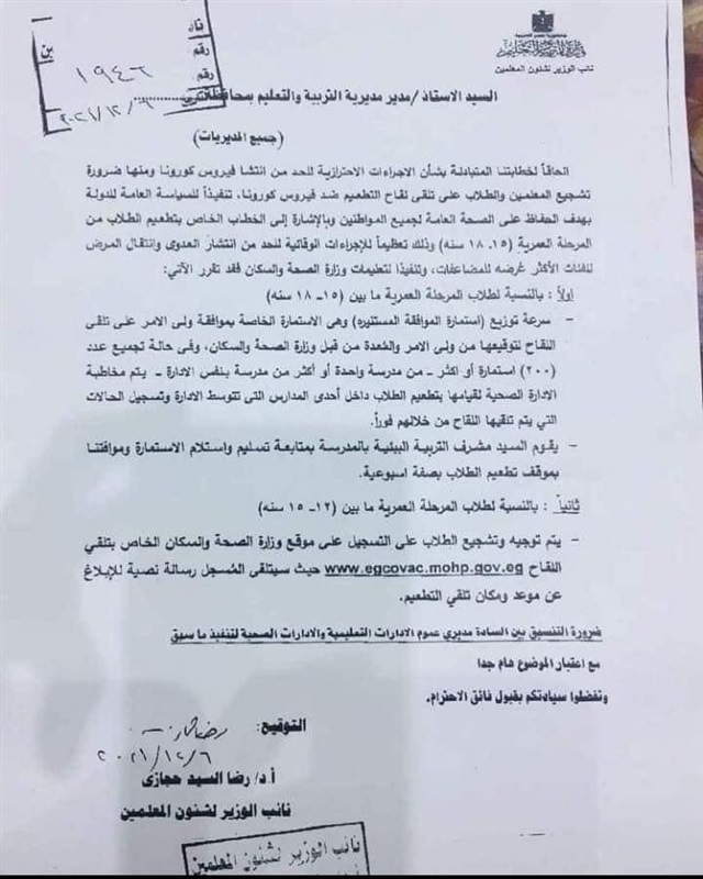 أرسلت وزارة التربية والتعليم والتعليم الفني، خطابا لمديريات التربية والتعليم بشأن الإجراءات الاحترازية للحد من انتشار فيروس كورونا ومنها ضرورة تشجيع المعلمين والطلاب على تلقى لقاح التطعيم ضد فيروس كورونا.