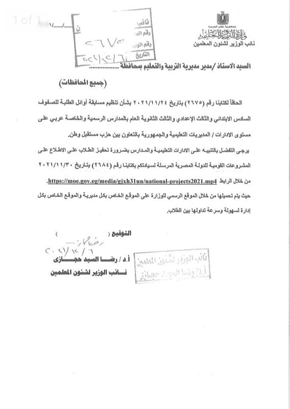 أعلنت وزارة التربية والتعليم والتعليم الفني، خطابا لمديريات التربية والتعليم والتعليم الفني، بشأن تنظيم مسابقة أوائل الطلبة للصفوف السادس الابتدائي والثالث الإعدادي والثالث الثانوية العام بالمدارس الرسمية والخاصة عربي على مستوى الإدارات المديريات التعليمية والجمهورية بالتعاون بين حزب مستقبل وطن.