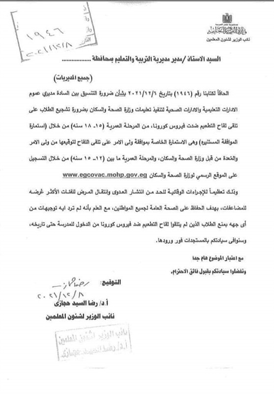 عممت وزارة التربية والتعليم والتعليم الفني، خطاب على المديريات التعليمية، بشأن التنسيق بين مديري عموم الإدارات التعليمية والصحية، لتنفيذ تعليمات وزارة الصحة والسكان بضرورة تشجيع الطلاب على تلقي لقاح التطعيم ضد فيروس كورونا، من المرحلة العمرية 15/18 سنة.