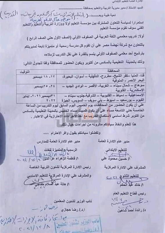 عممت وزارة التربية والتعليم والتعليم الفني، خطاب على المديريات التعليمية، بشأن تدريب معلمي اللغة العربية في الصفوف الأولى، بالتعاون مع مؤسسة مصر الخير .