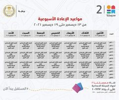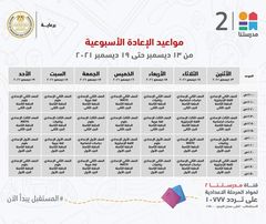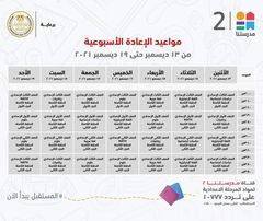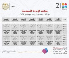 ويمكن للطلاب من الصف الأول الإعدادي حتى الشهادة الإعدادية معرفة مواعيد عرض البرامج التعليمية للصفوف الإعدادية، في الفترة من 13 ديسمبر حتي 19 ديسمبر باللغة العربية مع الإعادة، على قناة مدرستنا 2 على التردد 10777، ولمعرفة المواعيد شاهد الصور الصور المرفقة.