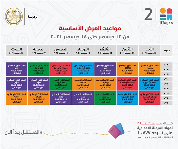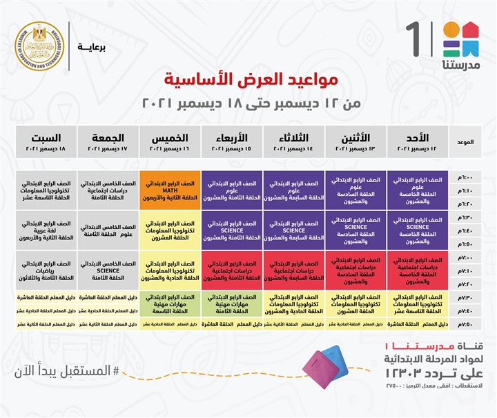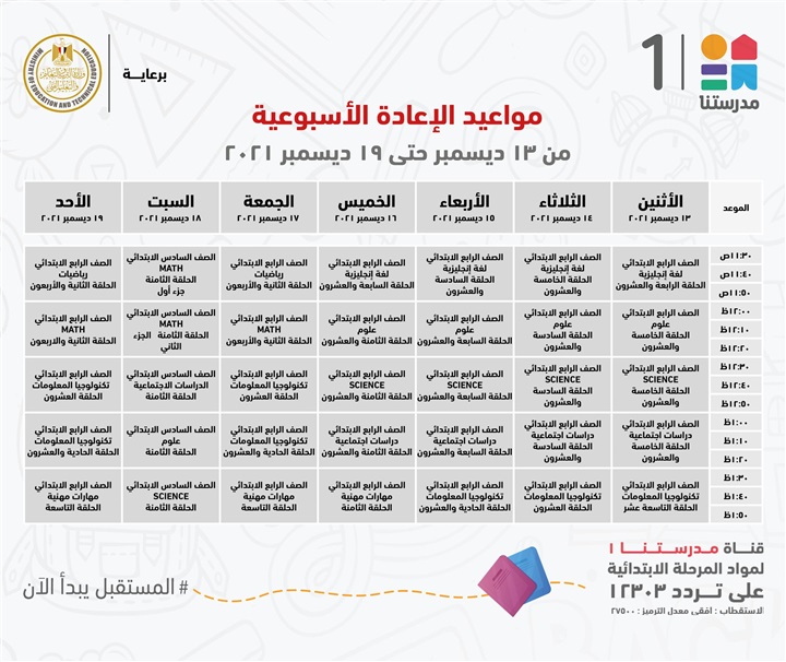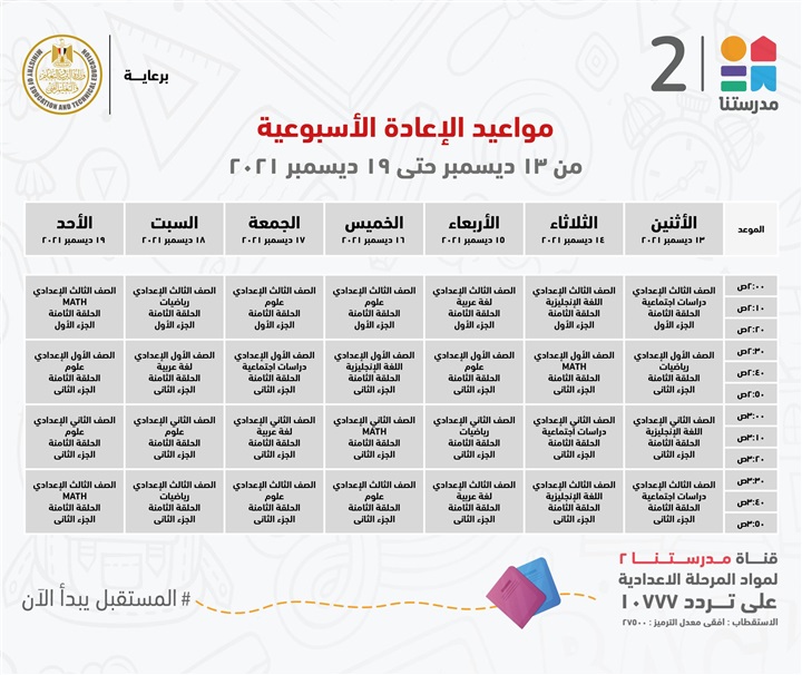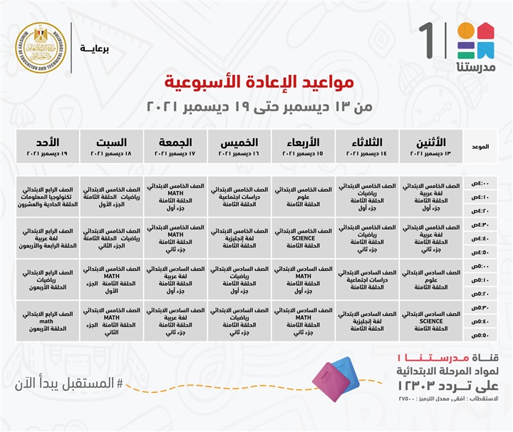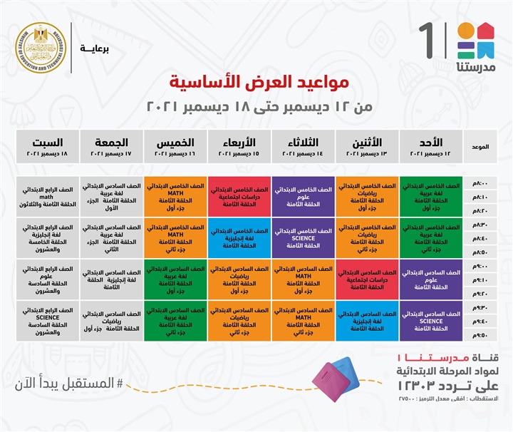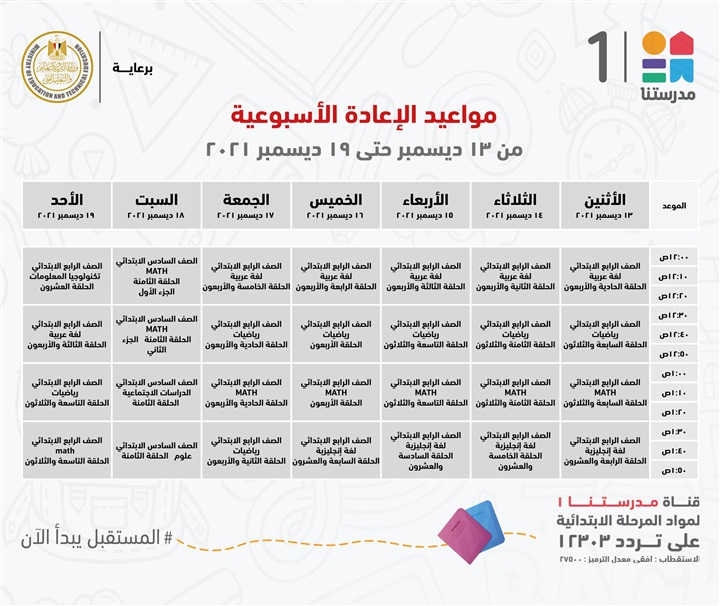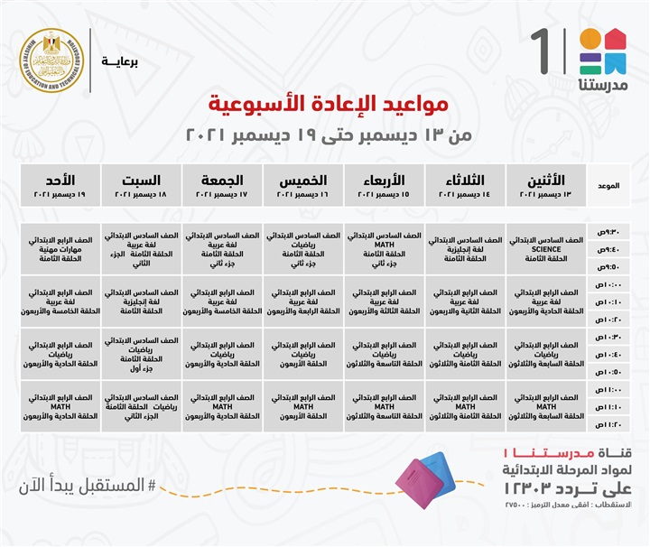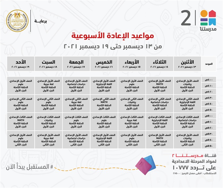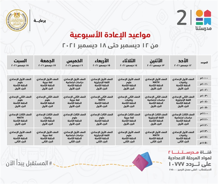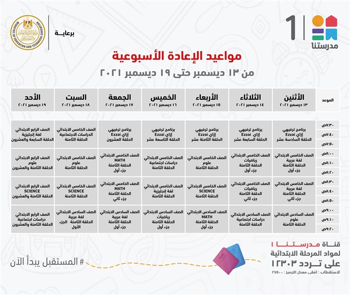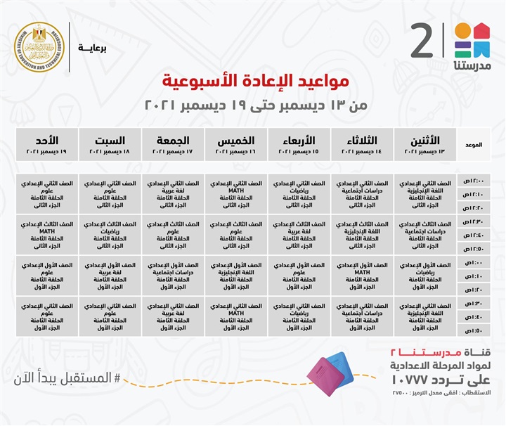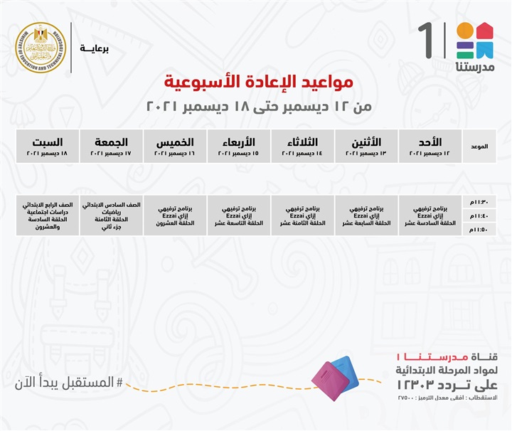 أعلنت وزارة التربية والتعليم والتعليم الفني، مواعيد عرض البرامج التعليمية لطلاب االمرحلتين الابتدائية والإعدادية من الصف الرابع الابتدائي حتى الشهادة الإعدادية عبر قناة "مدرستنا ١، ٢" في الفترة من ١٢ ديسمبر حتى ١٨ ديسمبر بالإضافة إلى مواعيد الإعادة، ولمعرفة المواعيد شاهد الصور المرفقة.