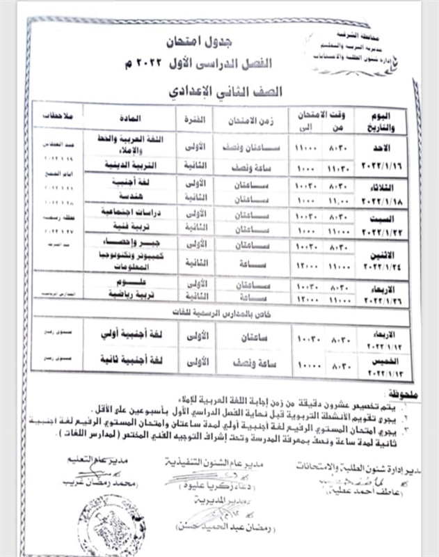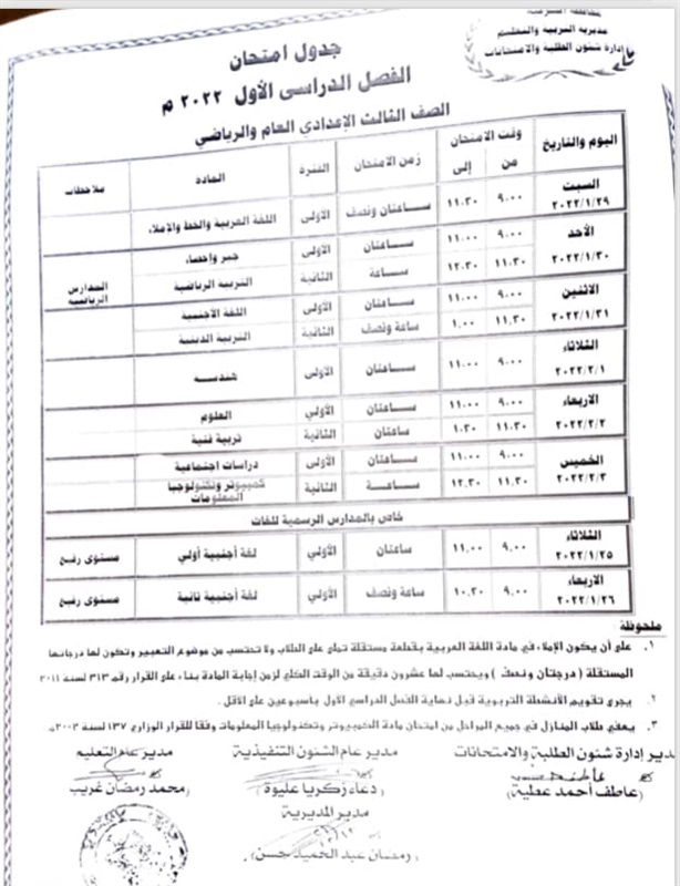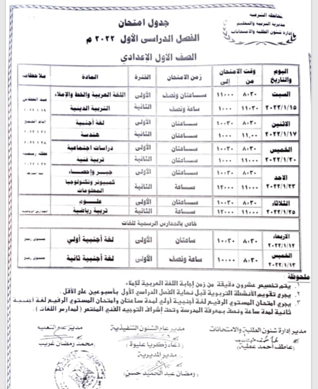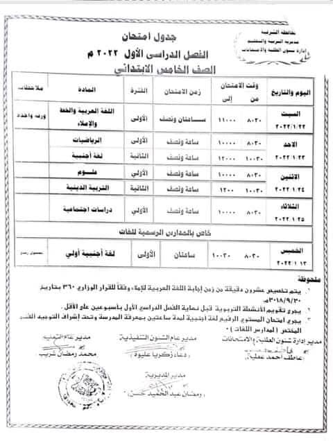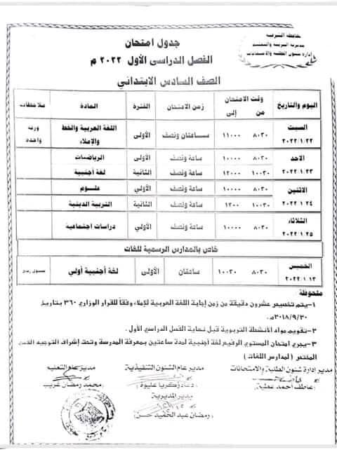 والتعليم بالشرقية عن الجداول الخاصة بامتحانات الفصل الدراسي الاول لكل من الصفوف