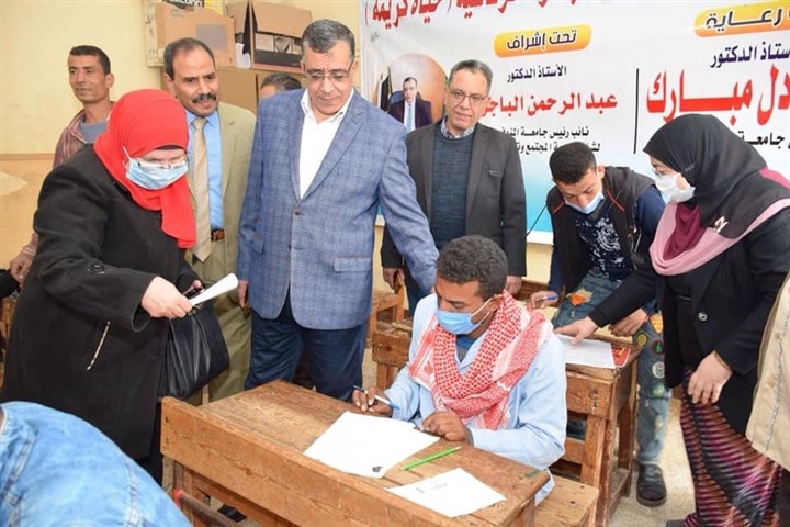وقام مستشار رئيس الجامعة لخدمة المجتمع يرافقه الدكتور صبحى شرف عميد كلية التربية والدكتور أحمد الفيومي عميد كلية الطب البيطري، والدكتور عبدالرحمن السباعي وكيل كلية الطب بمتابعة العمل بتخصصات القافلة المتكاملة حيث تم توقيع الكشف على الحالات التى بلغت على مدار اليوم ٢٥٠٠ حالة، وتقديم العلاج المجاني لهم وتحويل الحالات التى تستوجب التوجه إلى المستشفيات الجامعية لعمل اللازم، كما تم الكشف على ٢٠٠٠ حالة بيطرية.