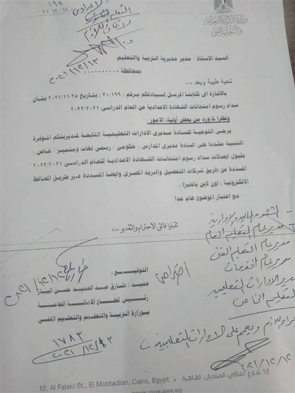 أصدرت وزارة التربية والتعليم والتعليم الفني، خطابآ للمديريات التعليمية بمحافظات الجمهورية، بشأن سداد رسوم امتحانات الشهادة الاعدادية عن العام الدراسی ۲/۲۰۲۱ ۲۰۲م .
