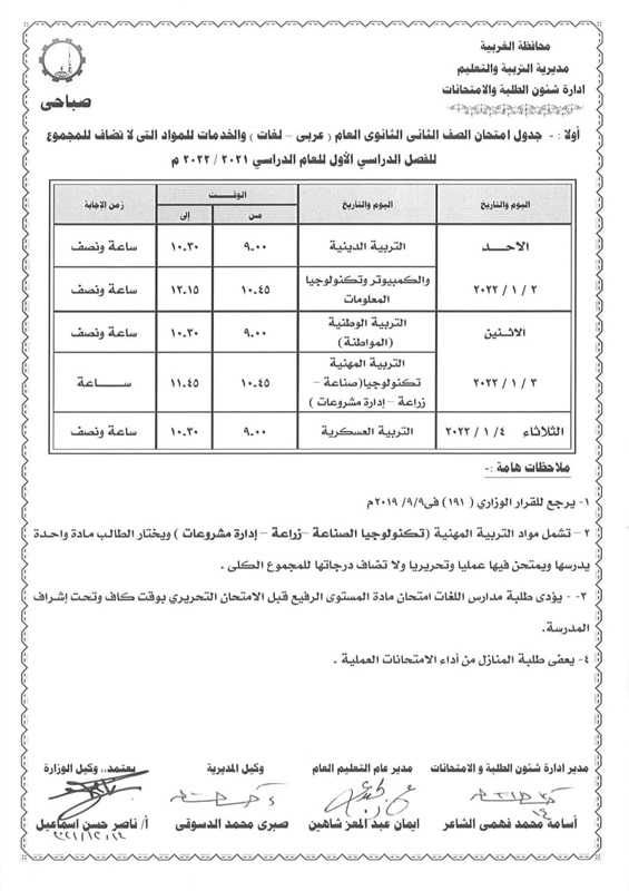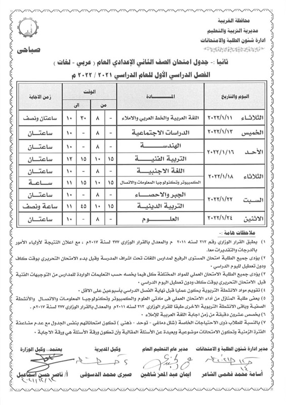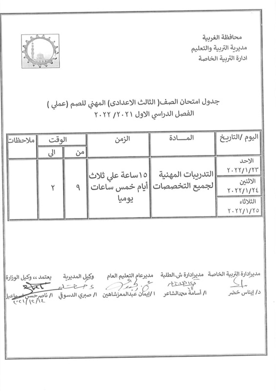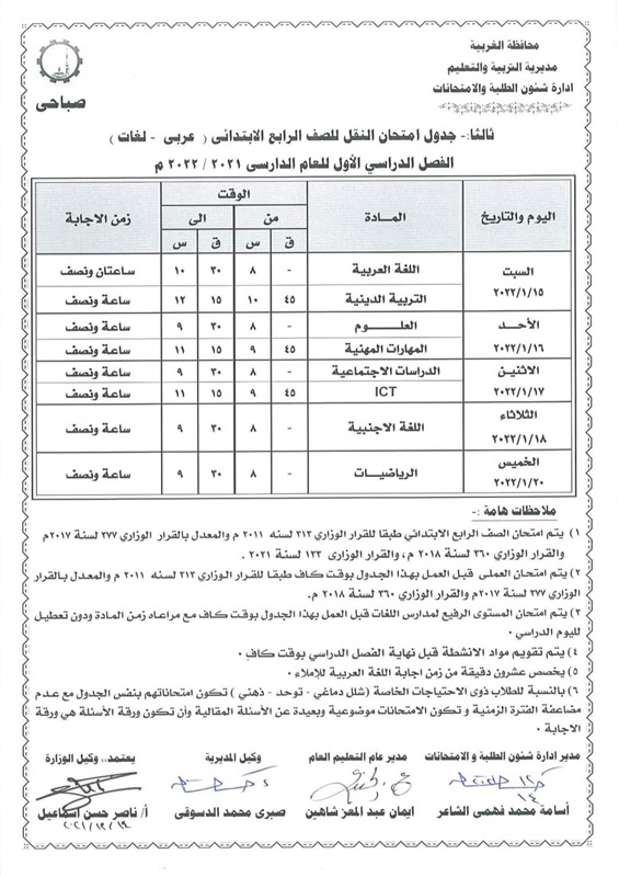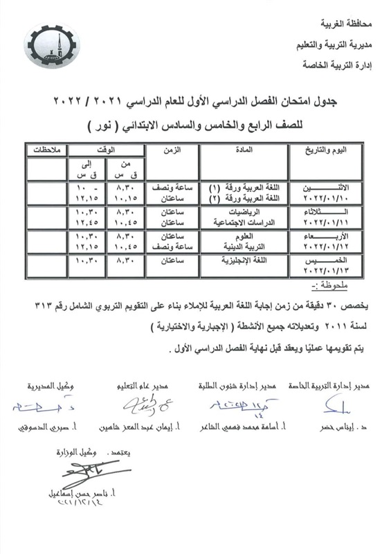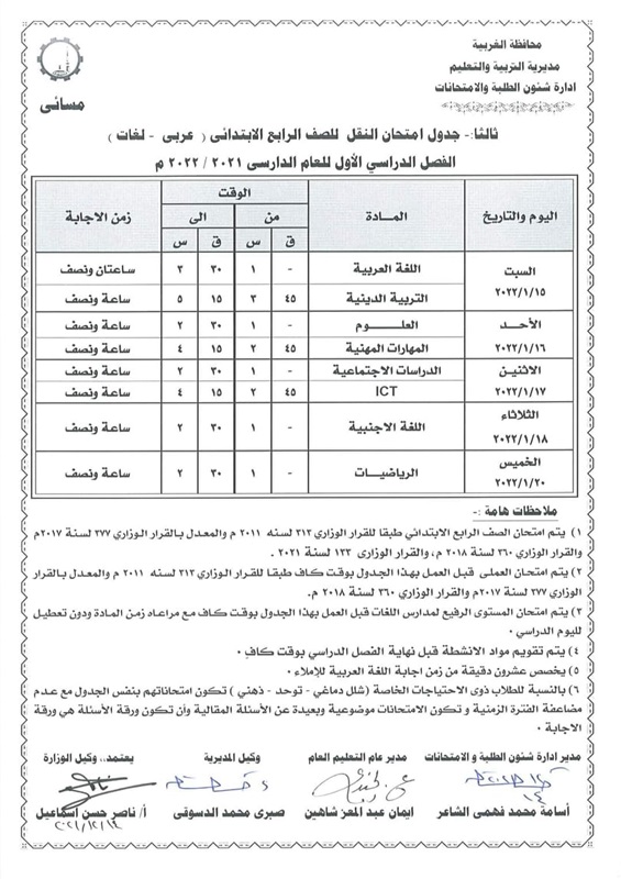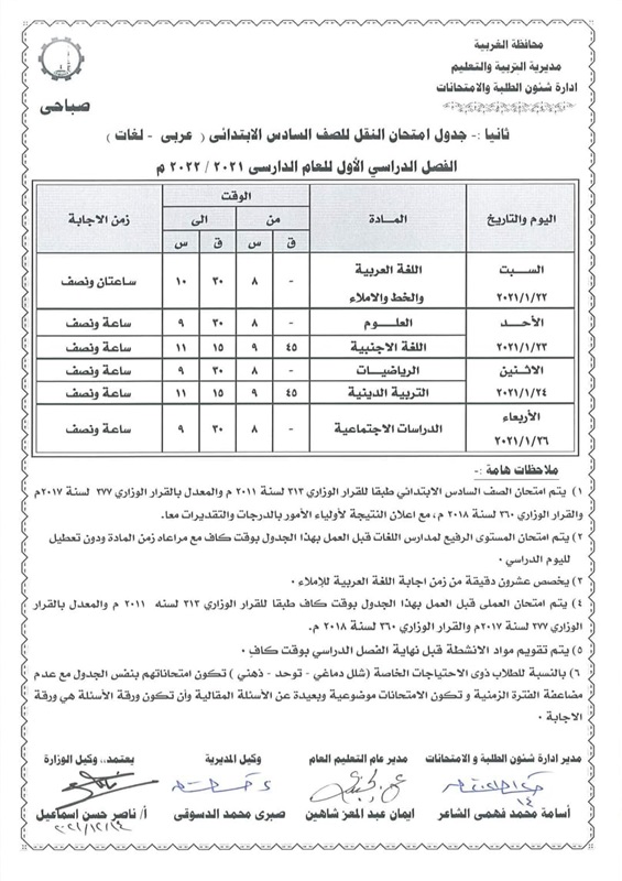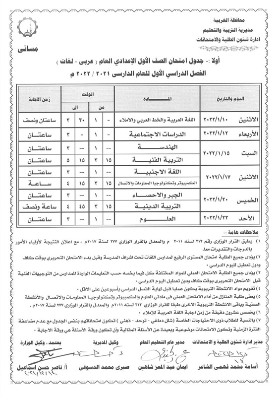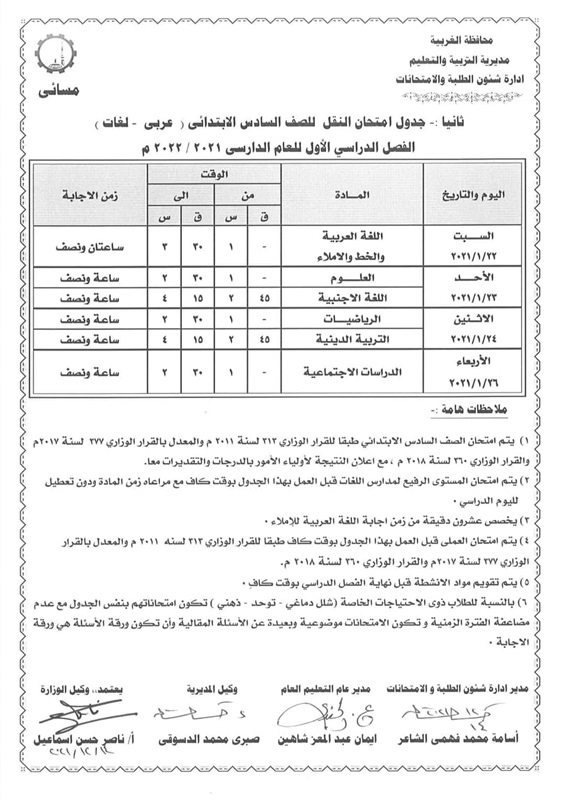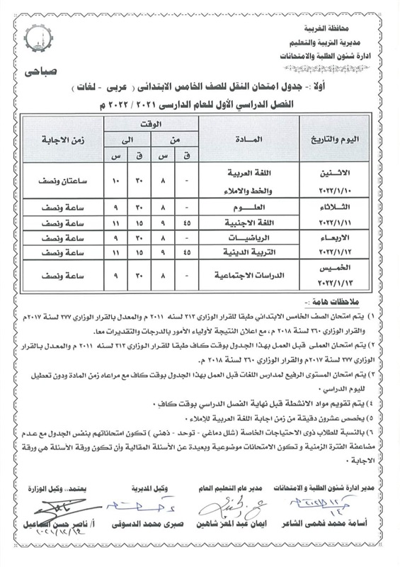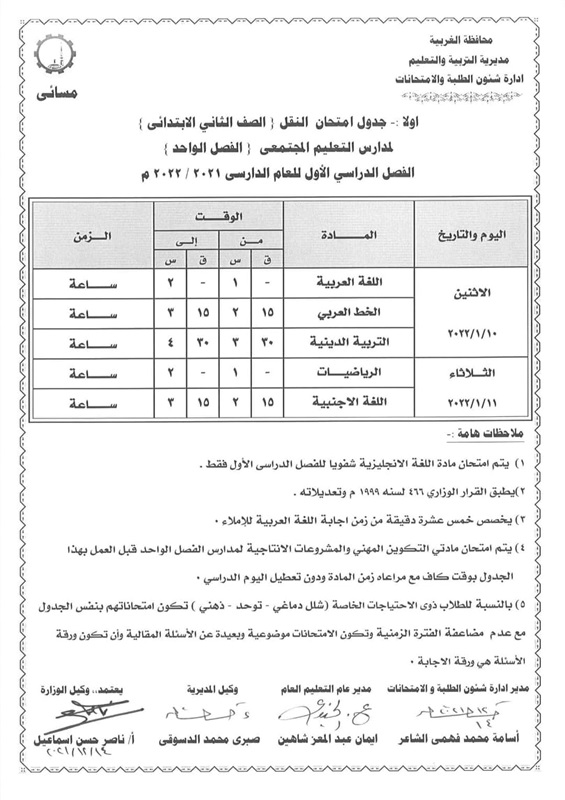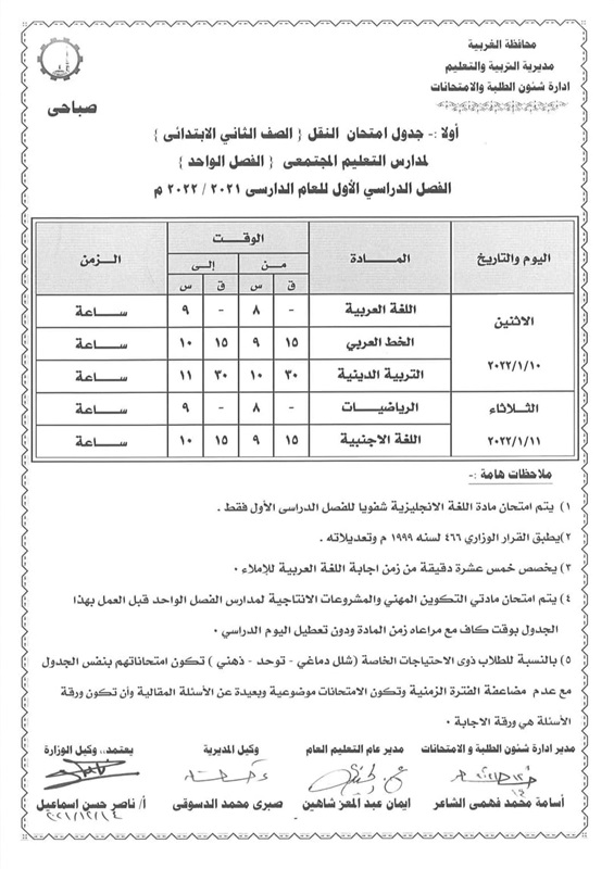 أعلنت مديرية التربية والتعليم بمحافظة الغربية، جداول امتحانات النقل والشهادات المحلية (التعليم العام) لامتحانات الفصل الدراسي الأول